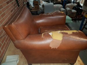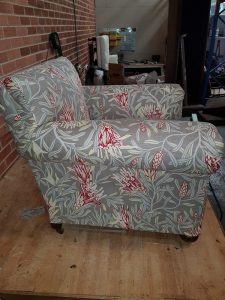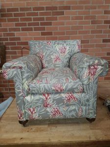 It’s nice to see an oldie redone from leather to fabric. The frame itself was probably 50+ years old and still in good condition. These types of armchairs are solid, comfy and worth the love. The fabric and foam needed to be replaced as you see was ripped and sagging and the Mountain devil fabric by utopia goods was a great choice and looked awesome on this.