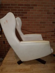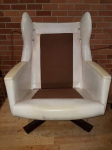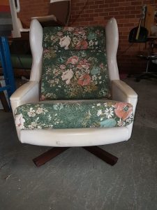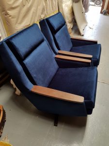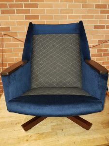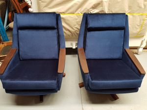 When our client came to us with these chairs, she wanted to completely change the look of them from the old rounded wing back with floral cushions and the vinyl look to a straight back with a deep blue velour and wooden arms. It was a challenge for us as we had to restructure the whole chair, cutting off the wing back and replacing the arm panels with a nice wood finish. The wooden arms complimented the wooden swivel legs and the choice of material was just royalty!